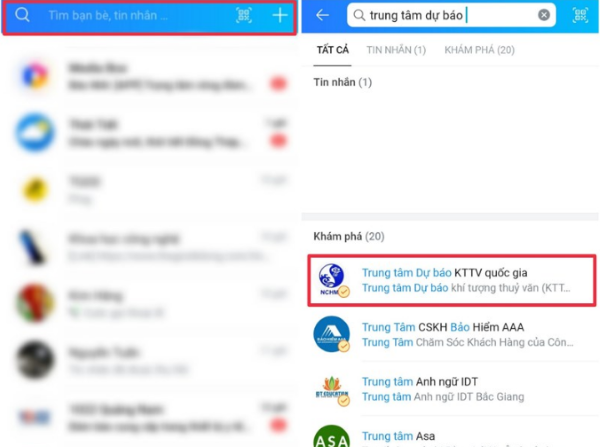 Bước 1: Truy cập vào ứng dụng Zalo > Nhập vào khung tìm kiếm từ khóa Trung tâm dự báo KTTV quốc gia.