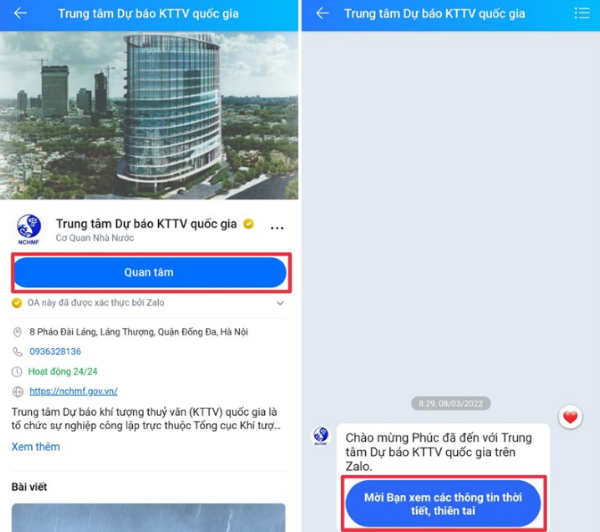 Bước 2: Bấm chọn vào Quan tâm > Tiếp theo Zalo sẽ chuyển bạn đến giao diện khung chat > Mời bạn xem các thông tin thời tiết, thiên tai.