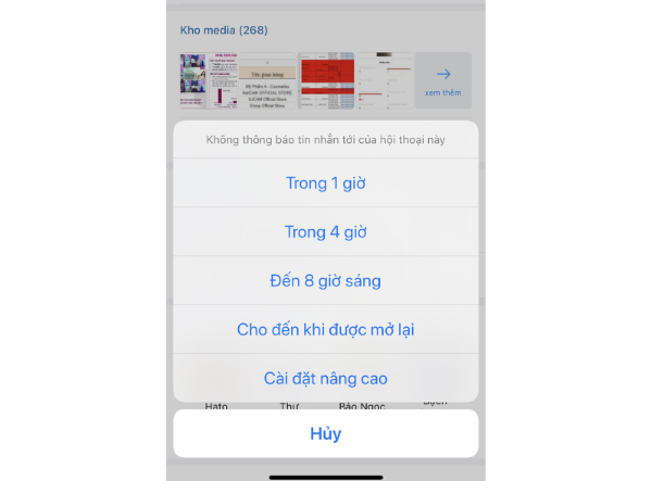 Bước 3: Chọn thời gian tắt thông báo. Như vậy, bạn đã hoàn tất việc tắt thông báo tin nhắn thời tiết trên ứng dụng Zalo thành công.