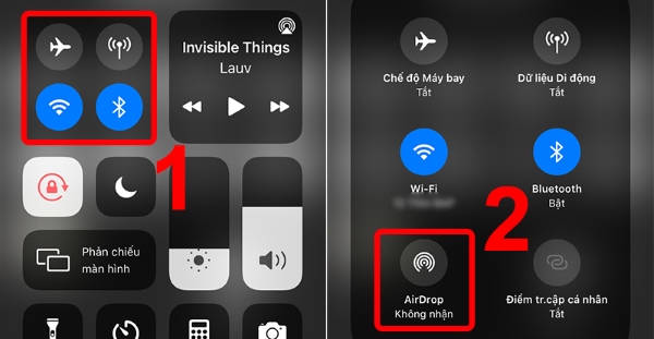 Bước 1: Bạn vuốt màn hình từ dưới lên để mở Bảng điều khiển nhanh > nhấn và giữ vào ô đầu tiên > chọn vào AirDrop.