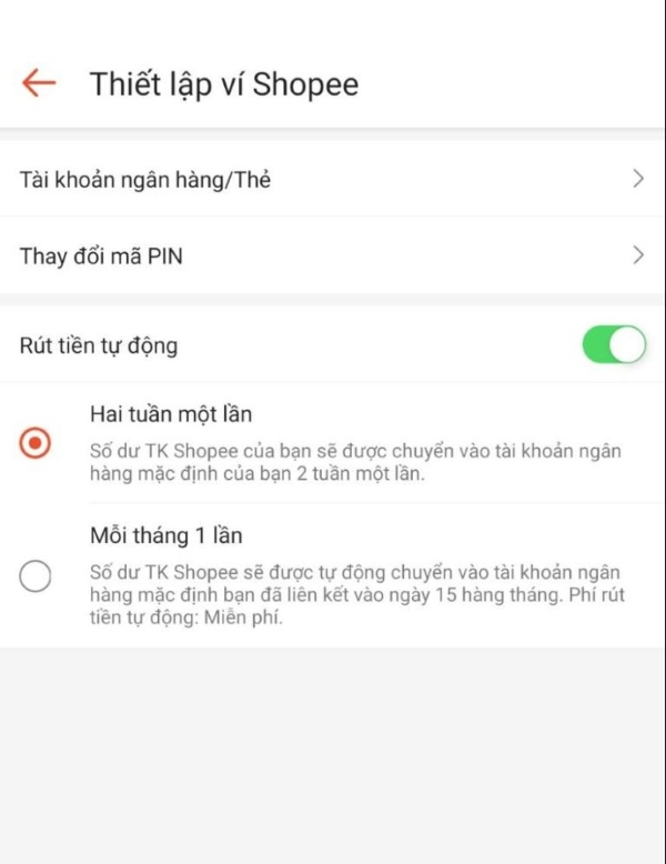 Đối với phương thức rút tiền tự động, bạn cần cho phép thiết lập chức năng thanh toán tự động cho số dư tài khoản Shopee. Theo chính sách chung của Shopee bạn có thể yêu cầu thao tác rút tiền 2 lần/tháng hoặc thời gian cố định 1 lần/tháng. Việc rút tiền về tài khoản ngân hàng đã liên kết sẽ được thực hiện vào thời gian cụ thể là thứ ba của tuần đầu tiên và thời gian tuần thứ 3 trong tháng.