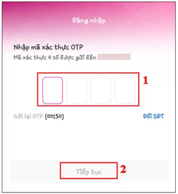 Bước 2: Nhập chính xác thông tin mã xác nhận OTP 6 số được gửi về số điện thoại mới mà bạn vừa sử dụng để đăng ký với tài khoản ví điện tử MoMo > Bấm chọn vào Tiếp tục.