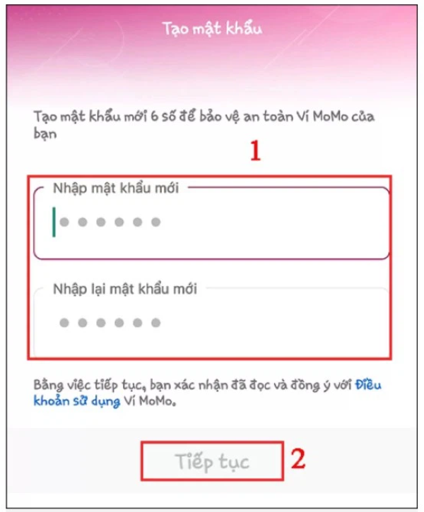 Bước 3: Thiết lập mật khẩu bảo mật của bạn, đảm bảo nhập 2 lần thông tin trùng khớp nhau > Chọn vào phần Tiếp tục.