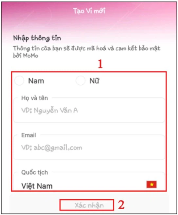 Bước 4: Nhập các thông tin cá nhân cụ thể theo yêu cầu của MoMo bao gồm: Họ tên, giới tính, quốc tịch và email > Bấm vào phần Xác nhận để có thể hoàn tất việc đăng ký tài khoản ví điện tử MoMo sử dụng số điện thoại mới.