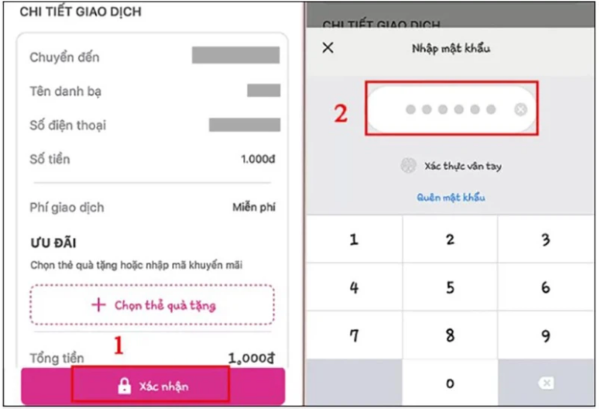 Bước 4: Kiểm tra kỹ các thông tin người nhận và số tiền đảm bảo tính chính xác > Bấm vào Xác nhận và thực hiện nhập mật khẩu để hoàn thành các thao tác chuyển tiền.