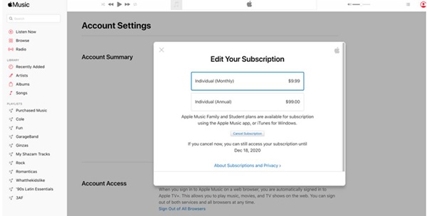 Nếu không thể truy cập được Apple Music trên thiết bị, bạn có thể hủy đăng ký bằng cách đăng nhập vào thư viện iTunes trên bất kỳ trình duyệt web nào.