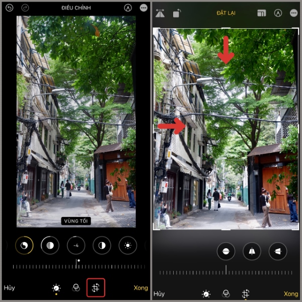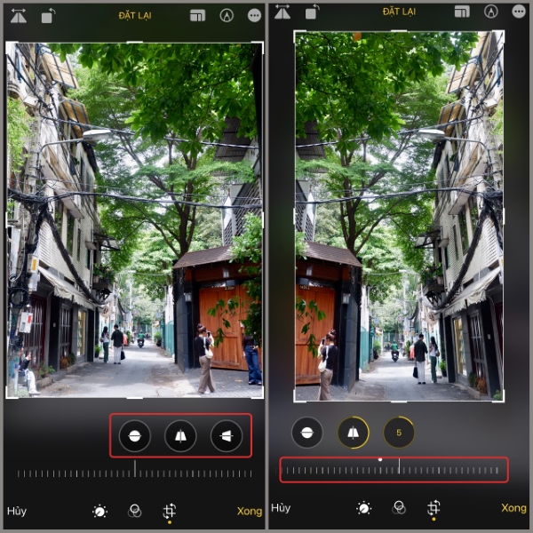 Bạn hãy kéo chọn hiệu ứng mong muốn chỉnh sửa, rồi điều chỉnh để có được góc độ hình ảnh ưng ý nhất. Sau khi hoàn thành, bạn nhấn Xong để lưu ảnh đã chỉnh sửa.