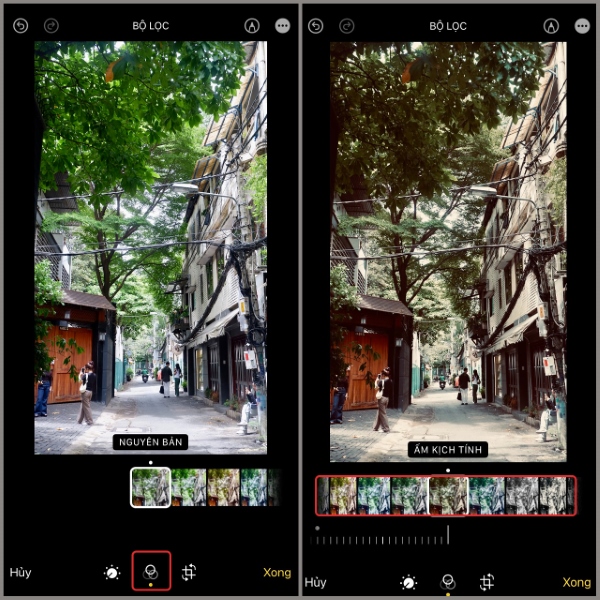 Trong phần Sửa ảnh, bạn nhấn chọn vào biểu tượng 3 hình tròn, sau đó kéo chọn những bộ lọc hiệu ứng có sẵn. Sau khi bạn đã chọn được sắc màu ưng ý, nhấn Xong để lưu lại ảnh đã chỉnh sửa.