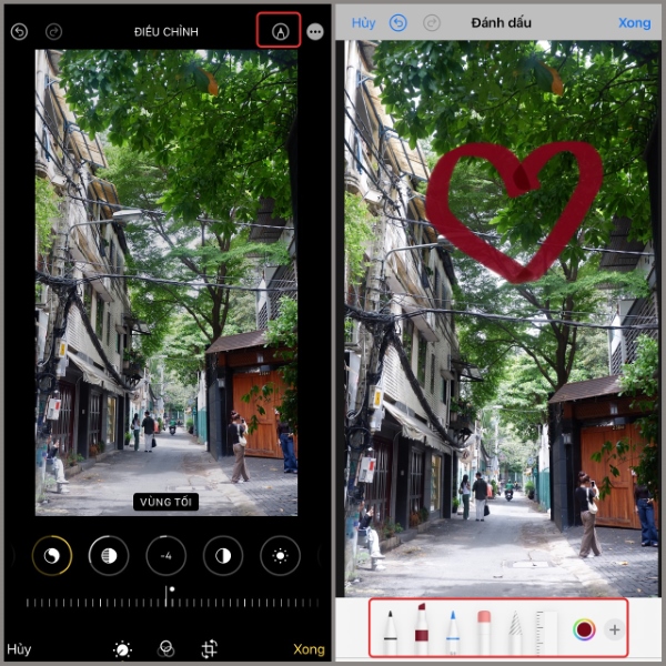 Trong mục chỉnh sửa, bạn nhấn chọn vào biểu tượng cây bút sẽ thấy hiển thị nhiều loại bút và màu sắc khác nhau. Bạn có thể sử dụng những công cụ này để viết và vẽ lên hình ảnh theo ý muốn.