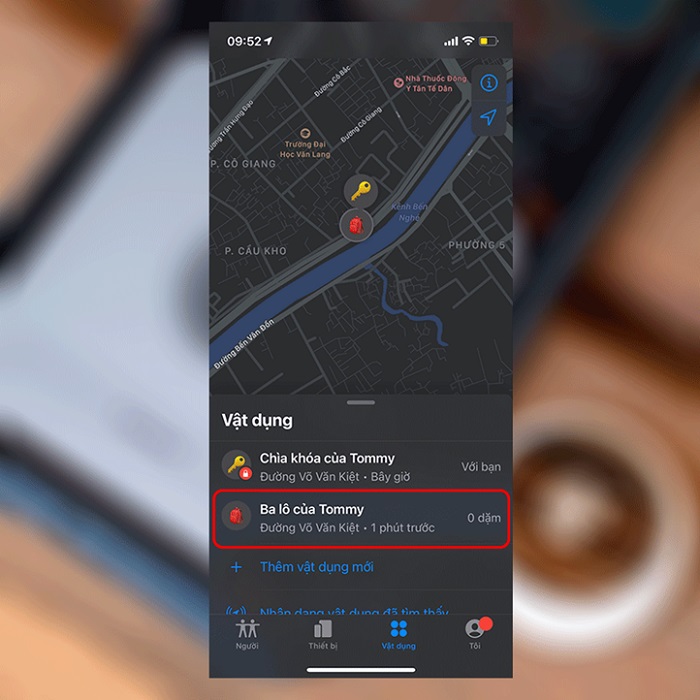 Bước 1: Vào ứng dụng “Tìm” trên điện thoại iPhone của bạn và sau đó chọn tab “Vật dụng”.
