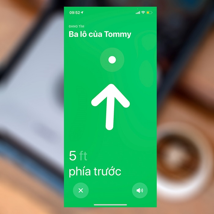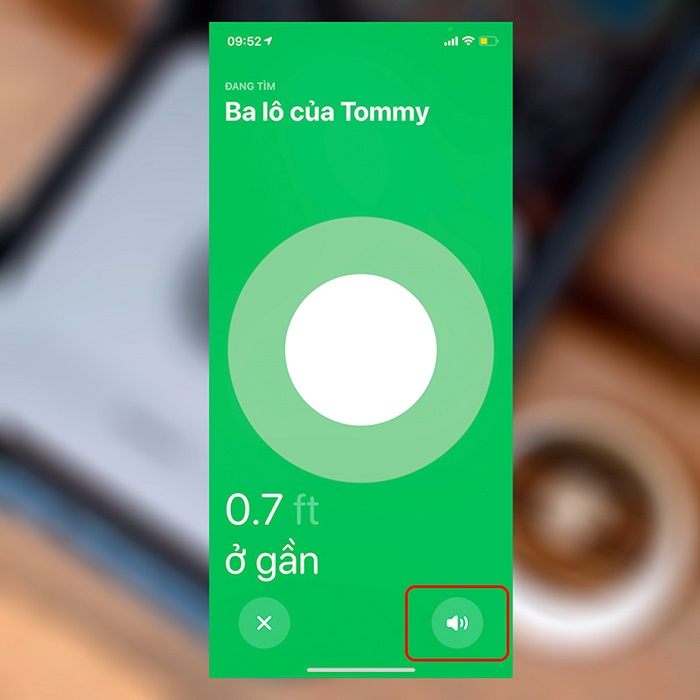 Khi đã đến gần với đồ vật có gắn AirTag thì mũi tên sẽ không còn nữa. Trên màn hình có biểu tượng chiếc loa ở góc dưới bên phải, bạn nhấn vào đó để AirTag phát ra tiếng kêu và việc tìm kiếm sẽ dễ dàng và nhanh chóng hơn.