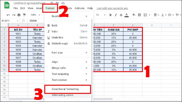 Trước khi nhập hàm để tô màu xen kẽ, bạn cần thực hiện cách đổi màu ô trong Google Sheets với các thao tác sau: Chọn vùng dữ liệu cần tô màu > Vào Format (Định dạng) > Chọn Conditional formatting (Định dạng có điều kiện).