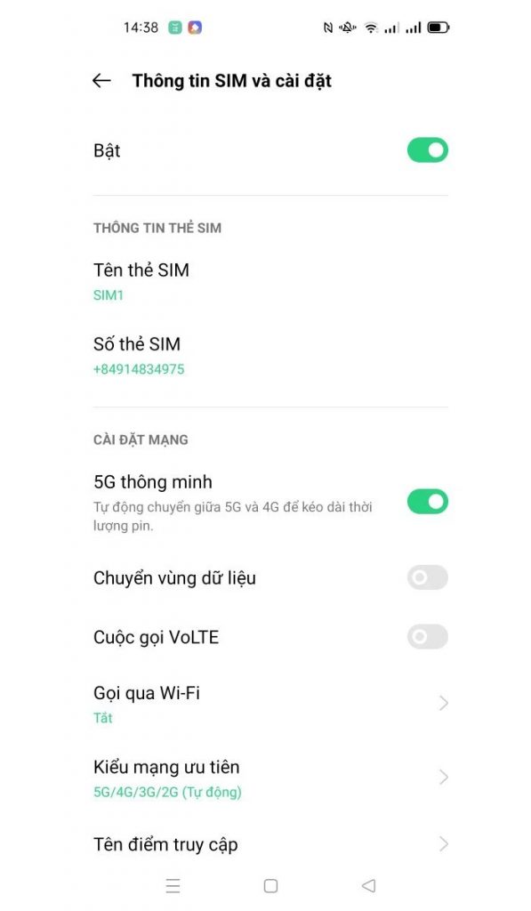 Vào “Cài đặt” -> chọn “Thẻ SIM và dữ liệu di động” -> chọn SIM (SIM 1 hoặc SIM 2 nếu lắp cả 2 sim) -> Bật tùy chọn “5G thông minh”.