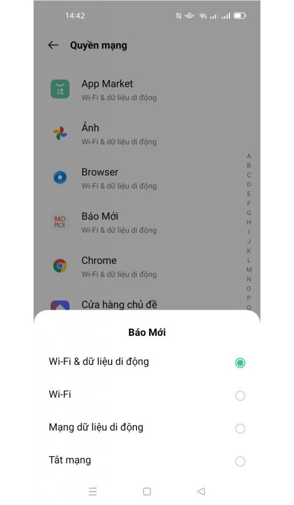 Tiếp theo, bạn chọn một ứng dụng không cho phép sử dụng wifi và dữ liệu di động. Trong trường hợp này chúng tôi chọn Báo mới. Các tùy chọn bạn có thể lựa chọn: