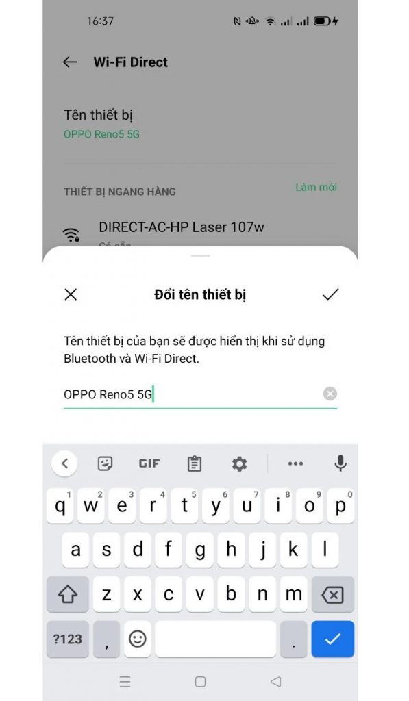 Muốn đổi tên Wi-Fi Direct bạn chỉ cần thực hiện theo hướng dẫn sau: Vào “Cài đặt” -> chọn “Wi-Fi” -> Chọn “Cài đặt nâng cao” -> Chọn “Wi-Fi Direct” -> bấm vào “Tên thiết bị” -> Chọn “đổi tên thiết bị lại” và thực hiện đổi tên rồi nhấn vào dấu tích để xác nhận.