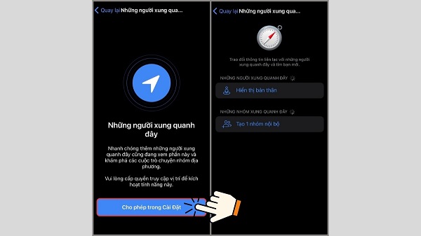 Bước 3: Nhấn chọn ‘Cho phép trong cài đặt’ để Telegram có thể sử dụng vị trí của bạn. Sau đó, Telegram sẽ gợi ý tất cả những người bạn ở gần khu vực với bạn.