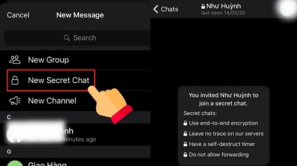 Bước 2: Nhấn chọn ‘New Secret Chat’ >> chọn người liên hệ để bắt đầu cuộc trò chuyện trong chế độ bí mật.