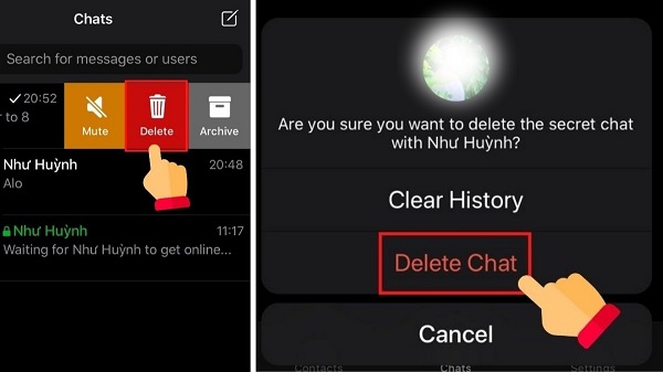 Bước 5: Bạn cũng có thể xóa nội dung tin nhắn bằng cách từ phải sang trái >>Chọn ‘Delete’ >> chọn ‘Delete Chat’ để hoàn thành thao tác.