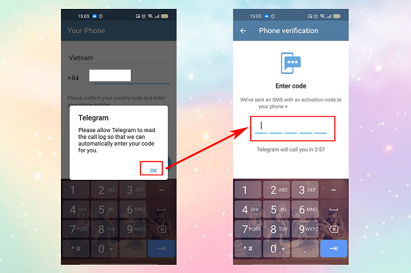 Bước 2: Hệ thống sẽ hỏi bạn có đồng ý cho phép việc xác nhận số điện thoại một cách tự động hay không, nếu như đồng ý thì bạn hãy nhấn OK >> Chọn quốc gia >> Nhập số điện thoại (bỏ số 0 ở đầu).