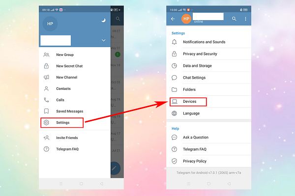 Bước 3: Người dùng hãy vào app Telegram trên điện thoại, sau đó nhấn vào phần Settings >> Chọn Devices.