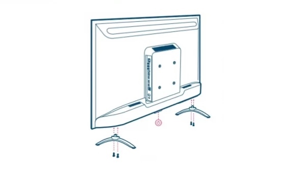 Bạn tiến hành chèn chân đế tivi bên trái/phải sang như trong hình và dùng vít siết chặt từng bên.