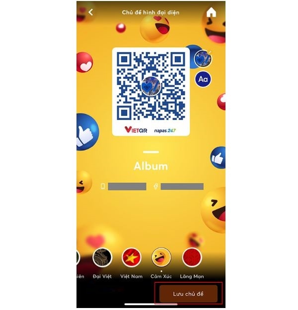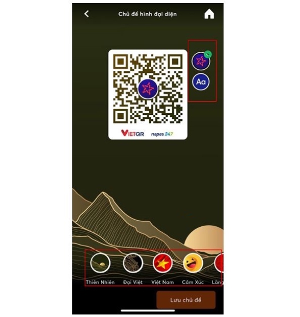 Bước 5: Chọn ảnh nền bạn yêu thích, hoặc thay đổi các chi tiết trên mã QR. Nếu muốn thay đổi các thông tin hiển thị trên mã QR, bạn hãy thực hiện như bước 6 và 7, nếu không, bạn nhấn lưu chủ đề.