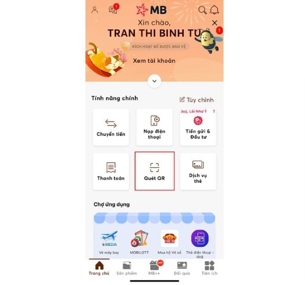 Bước 1: Mở ứng dụng MB Bank trên điện thoại lên, tại màn hình chính, bạn tìm và chọn tính năng Quét mã QR.