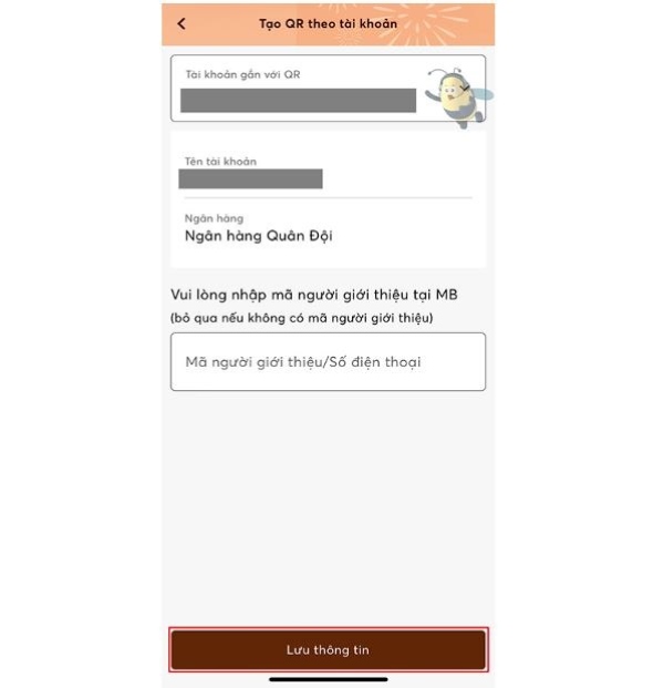 Bước 4: Chọn tài khoản nguồn mà bạn muốn gắn với mã QR. Sau đó nhấn lưu thông tin là bạn đã tạo mã QR MB Bank của mình thành công.