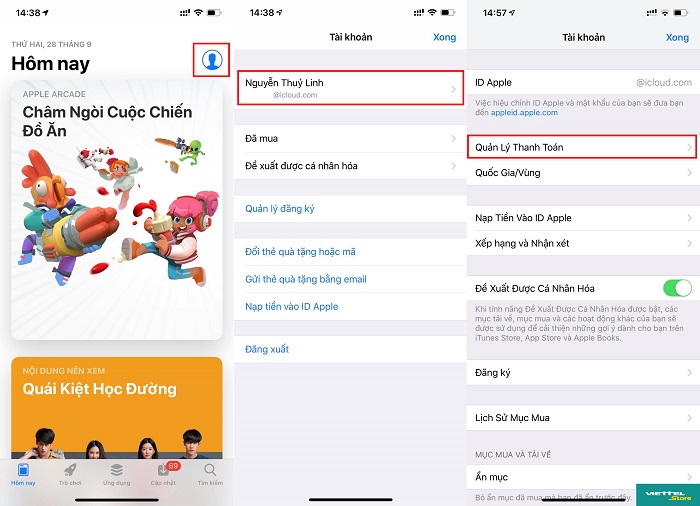 Đầu tiên, bạn mở ứng dụng App Store trên điện thoại iPhone, iPad và bấm chọn vào Avatar góc trên bên phải như hình bên dưới đây.Sau đó bạn vào tên của bạn sẽ thấy xuất hiện dòng Quản lý thanh toán, để lát ở bước bên dưới chúng ta sẽ nhập thông tin thẻ vào.