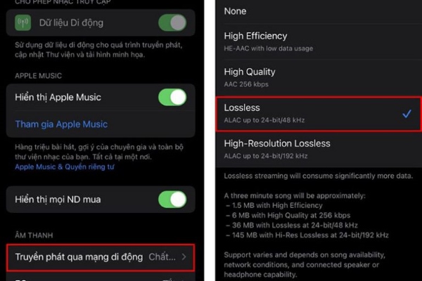 Bước 3: Đối với phiên bản điện thoại iPhone đã cập nhật iOS 14.6 trở lên, tại mục “Nhạc”, người dùng cũng có thể phát âm nhạc chất lượng cao Lossless. Bạn chọn vào mục Truyền phát qua mạng di động > chọn vào Lossless.