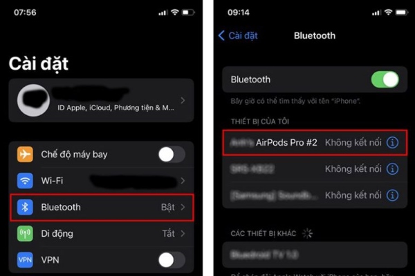 Bước 4: Để phát âm nhạc chất lượng cao Spatial Audio trên tai nghe AirPods, người dùng cũng cần truy cập vào Cài đặt > chọn mục Bluetooth. Tiếp theo, bạn chọn biểu tượng chữ “i” bên phải tên tai nghe của mình.