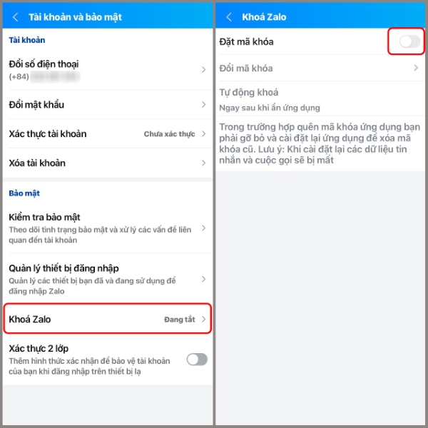 Bước 2: Chọn vào mục Khóa Zalo > gạt công tắc sang phải tại mục Đặt mã khóa để bật tính năng.