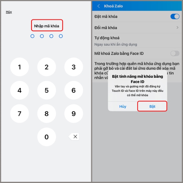 Bước 3: Đặt mã khóa mới cho ứng dụng Zalo > khi cửa sổ xuất hiện thông báo Bật tính năng mở khóa bằng Face ID, bạn nhấn Bật để dùng Face ID để mở khóa thay cho việc nhập mã khóa.