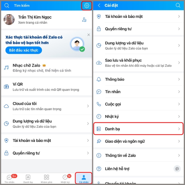 Bước 1: Trên thanh công cụ ở phía dưới màn hình, bạn chọn vào mục Cá nhân > chọn biểu tượng Cài đặt > nhấn vào mục Danh bạ.