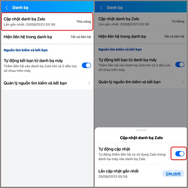 Bước 2: Chọn Cập nhật danh bạ Zalo > nhấn vào công tắt để bật tính năng Tự động cập nhật danh bạ.