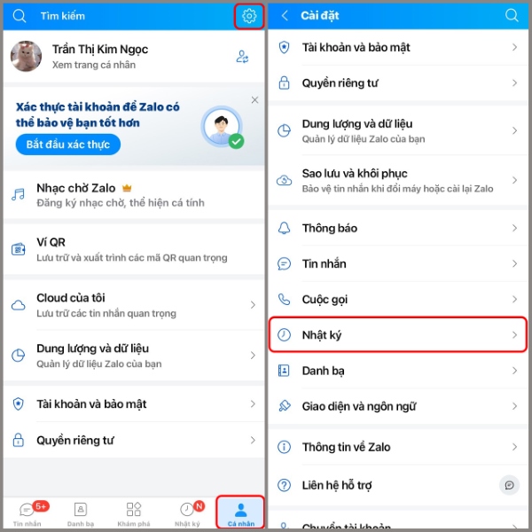 Bước 1: Trên thanh công cụ ở phía dưới màn hình, bạn chọn mục Cá nhân > nhấn vào biểu tượng Cài đặt > chọn mục Nhật kí.