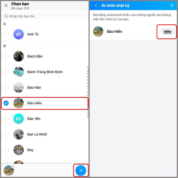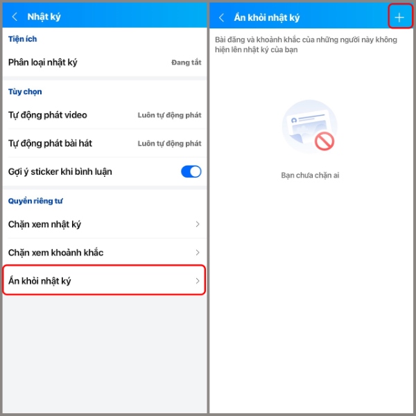 Bước 2: Tại mục Quyền riêng tư, bạn chọn Ẩn khỏi nhật ký > nhấn vào biểu tượng dấu cộng để thêm người dùng mà bạn muốn ẩn nhật ký từ họ.