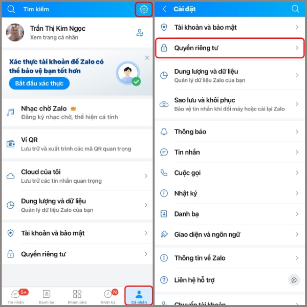 Bước 1: Trên thanh công cụ ở phía dưới màn hình, bạn chọn mục Cá nhân > nhấn chọn biểu tượng Cài đặt > chọn Quyền riêng tư.