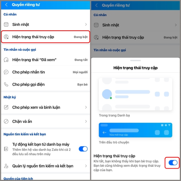 Bước 2: Tại phần Cá nhân, bạn chọn Hiện trạng thái truy cập > nhấn gạt công tắt sang trái để tắt tính năng hiện trạng thái hoạt động khi online.