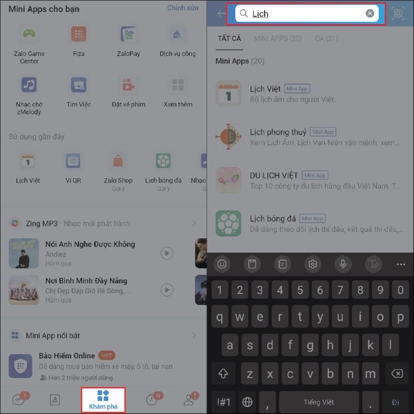 Bước 1: Trước tiên bạn mở ứng dụng Zalo trên điện thoại lên > nhấn vào Khám phá > nhập từ khóa “Lịch” vào ô Tìm kiếm.