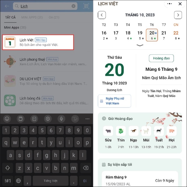 Bước 2: Sau đó bạn sẽ thấy gợi ý Lịch Việt thuộc Mini Apps trên kết quả tìm kiếm > nhấn chọn vào Lịch Việt để xem ngày hoàng đạo trên Zalo.