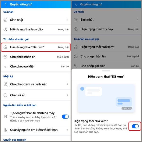 Bước 2: Tại mục Tin nhắn và cuộc gọi, bạn chọn mục Hiện trạng thái “Đã xem” > tiến hành gạt công tắt sang trái để tắt tính năng này đi.