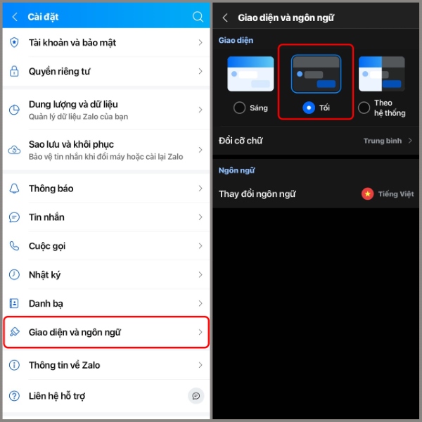 Trong Cài đặt, bạn chọn vào Giao diện và ngôn ngữ > chọn giao diện Tối để chuyển nền ứng dụng Zalo sang giao diện ban đêm.