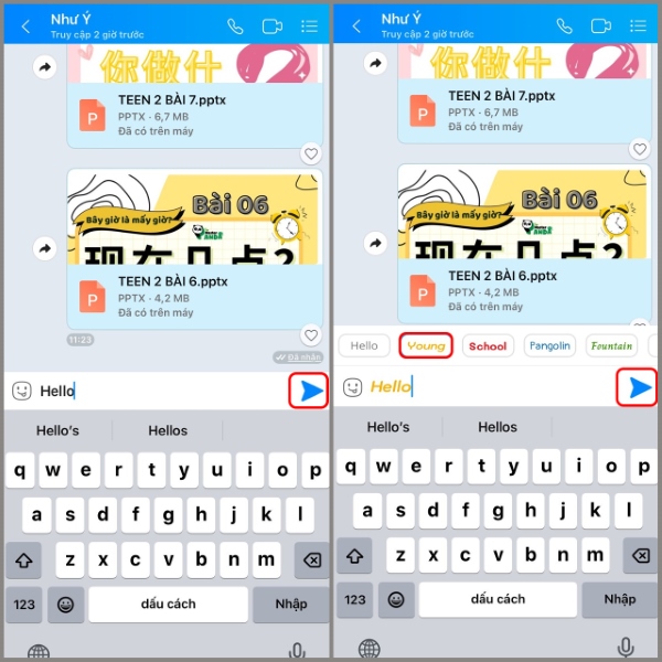 Bạn tiến hành soạn nội dung tin nhắn như bình thường > sau đó nhấn giữ nút Gửi > trên màn hình sẽ hiển cách tùy chọn kiểu chữ phía trên > bạn chọn kiểu chữ muốn dùng để đoạn tin nhắn trở nên sinh động và thú vị hơn.
