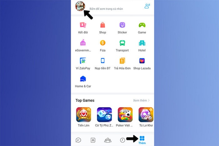 Trước tiên, bạn mở ứng dụng Zalo trên smartphone và nhấn nút Thêm ở góc phải màn hình. Sau đó, tiếp tục nhấn chọn mục Ảnh đại diện để có thể truy cập vào Trang cá nhân của mình.