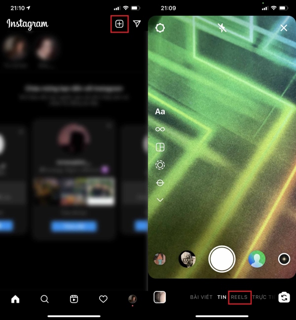 Bước 1: Sau khi tải và cài đặt Instagram trên điện thoại của mình, bạn truy cập vào ứng dụng Instagram > nhấn vào biểu tượng dấu cộng góc trên bên phải màn hình > chọn vào mục Reels ở thanh công cụ bên dưới.