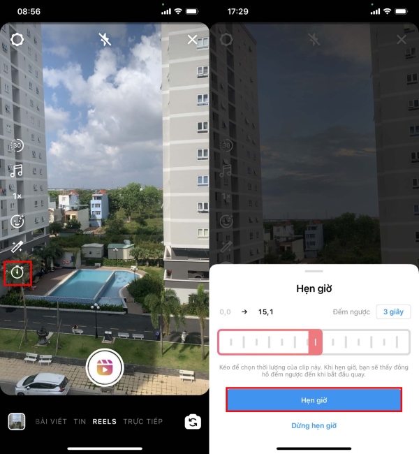 Bước 2: Tiếp theo, bạn nhấn vào biểu tượng đồng hồ để chọn thời lượng quay video và thời gian đếm ngược video > nhấn nút Hẹn giờ để chọn thời gian.