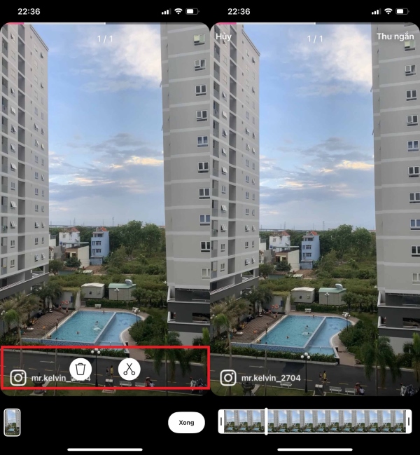 Bước 5: Sau khi quay video xong, bạn sẽ nhìn thấy video hiển thị ở bên dưới, nhấn vào video để chỉnh sửa > nhấn biểu tượng cây kéo để chọn đoạn video mà bạn muốn cắt để sử dụng > nhấn Thu ngắn để chọn đoạn video muốn cắt.