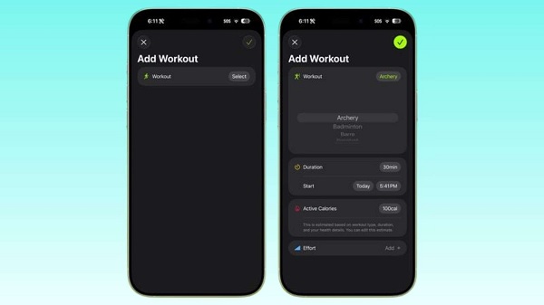 Ứng dụng Fitness cho phép người dùng tự tạo bài tập cá nhân hóa ngay trên iPhone, với các tùy chọn linh hoạt như loại hình vận động, lượng calo tiêu thụ, cường độ, thời lượng và thời gian bắt đầu.