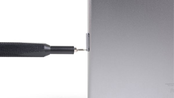 Bước 2: Mở khay SIM: Sử dụng que hoặc dụng cụ chọc SIM để chọc vào lỗ trên khay SIM và đẩy khay SIM ra khỏi iPad.